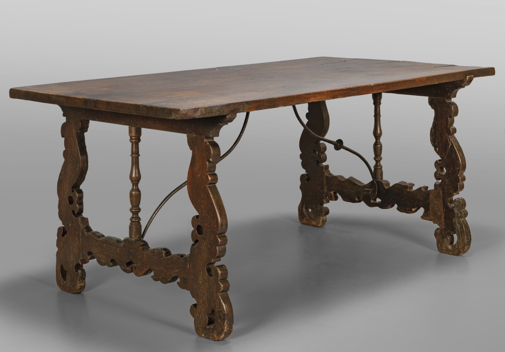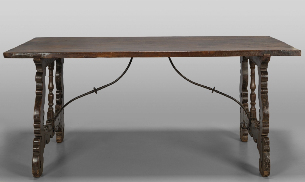 Grande tavolo a fratina in noce gambe raccordate da traverse in ferro fine sec.XVII