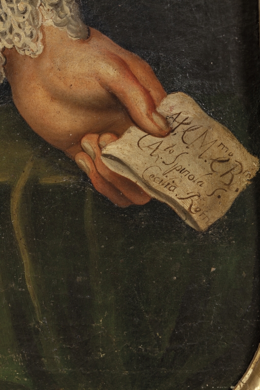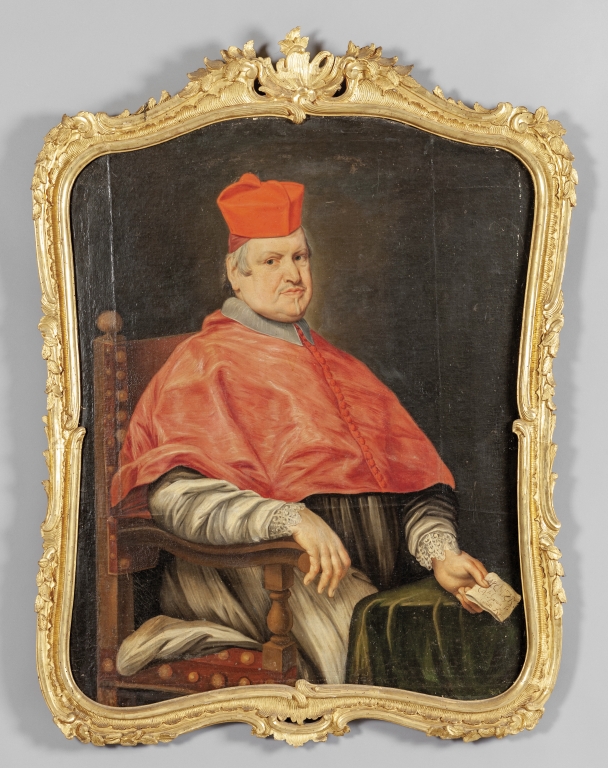 Scuola genovese sec.XVII 'Ritratto di cardinale' olio di forma sagomata bella cornice in legno intagliato con pellacce e dorato