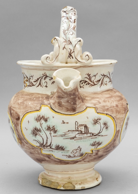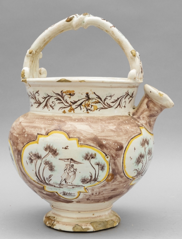 Brocca in ceramica decorata a riserve policrome su fondo manganese Savona sec.XVIII
