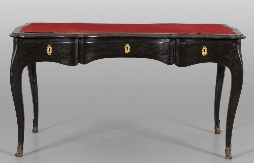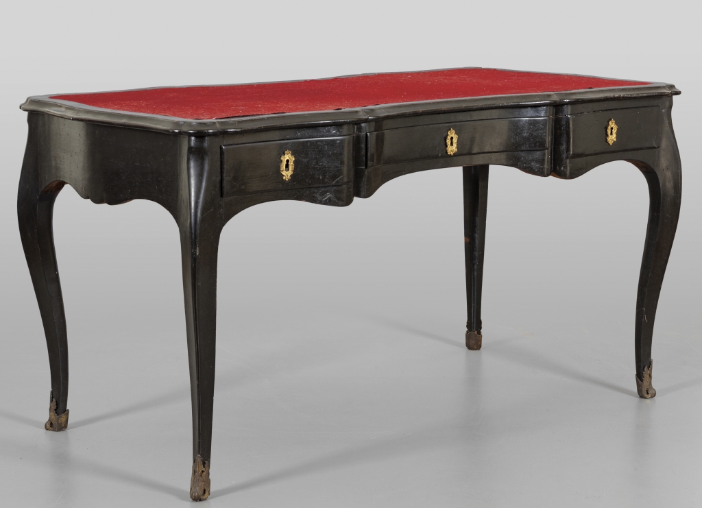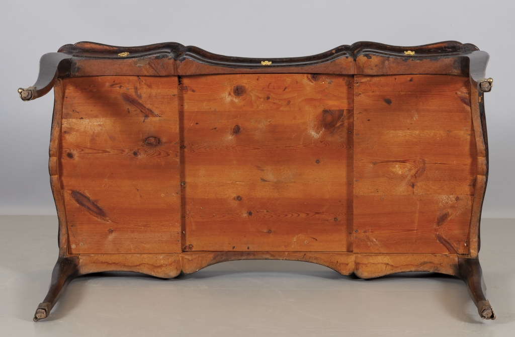 Diplomatica Luigi XV movimentata sul fronte e sui fianchi tre cassetti sul fronte piano lastronato con bordo in legno di testa piedini terminanti con scarpette in bronzo dorato Genova I metà sec.XVIII