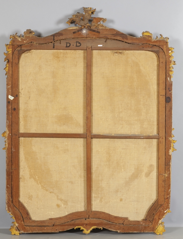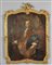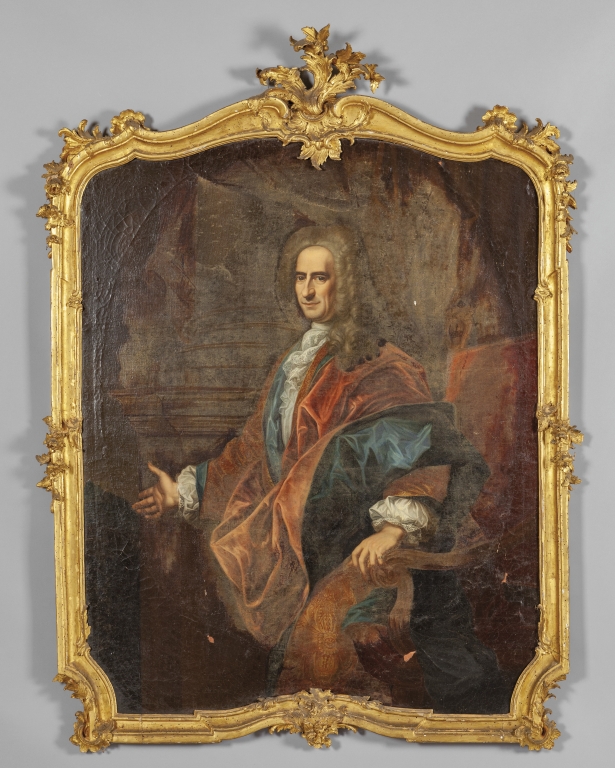 Scuola genovese sec.XVIII 'Gentiluomo seduto con parrucca' olio di forma sagomata bella cornice barocchetto in legno intagliato e dorato