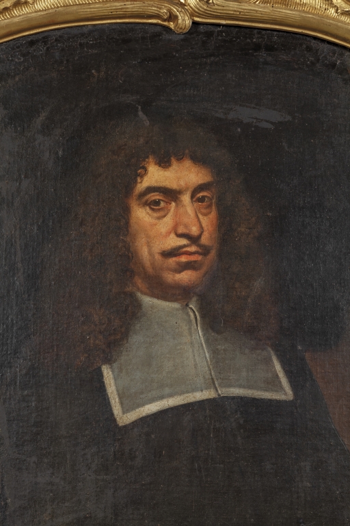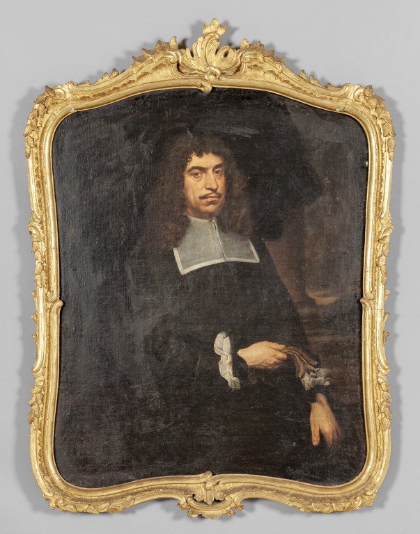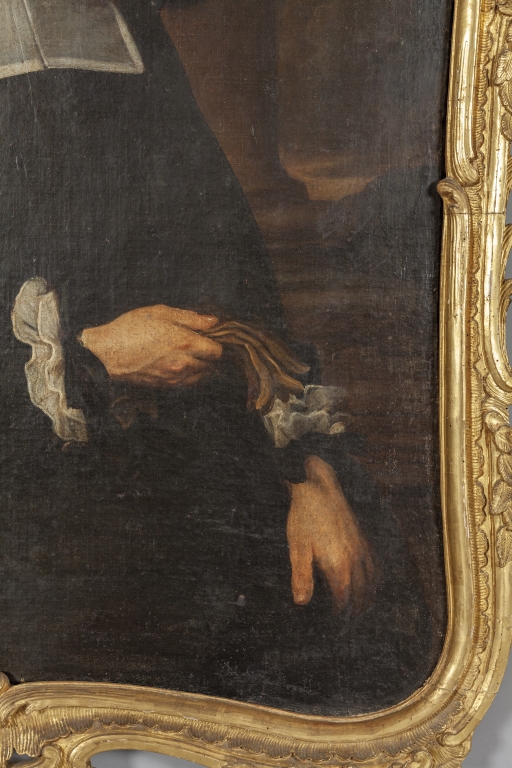 Scuola genovese sec.XVII 'Ritratto di nobiluomo con guanti' olio bella cornice barocchetto in legno intagliato e dorato