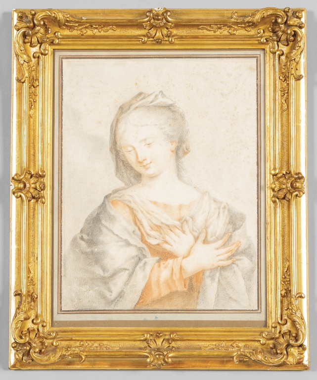 Scuola italiana sec.XVIII 'Madonnina' disegno colorato cornice in legno intagliato e dorato