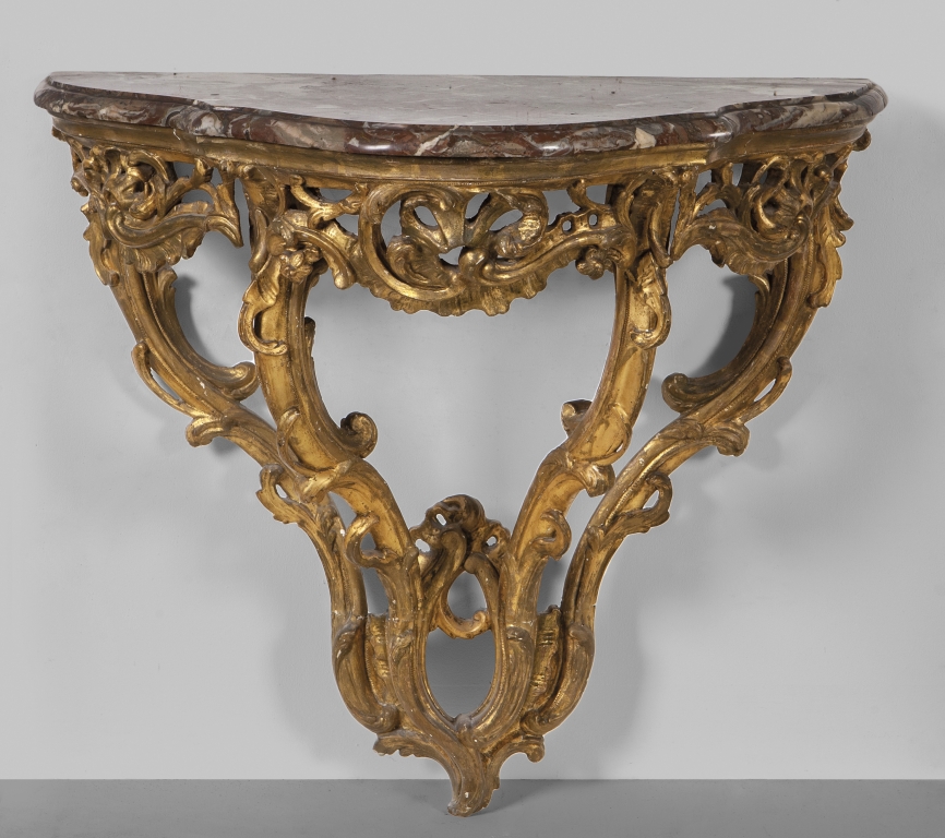 Console Luigi XV a goccia in legno finemente intagliato e dorato piano in breccia sec.XVIII