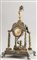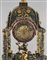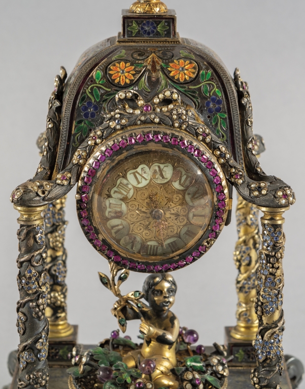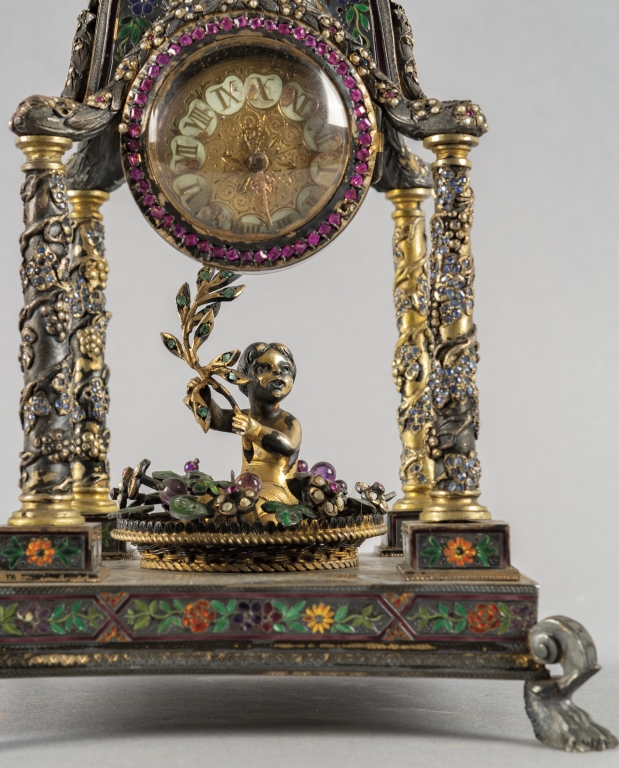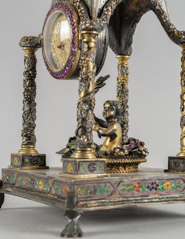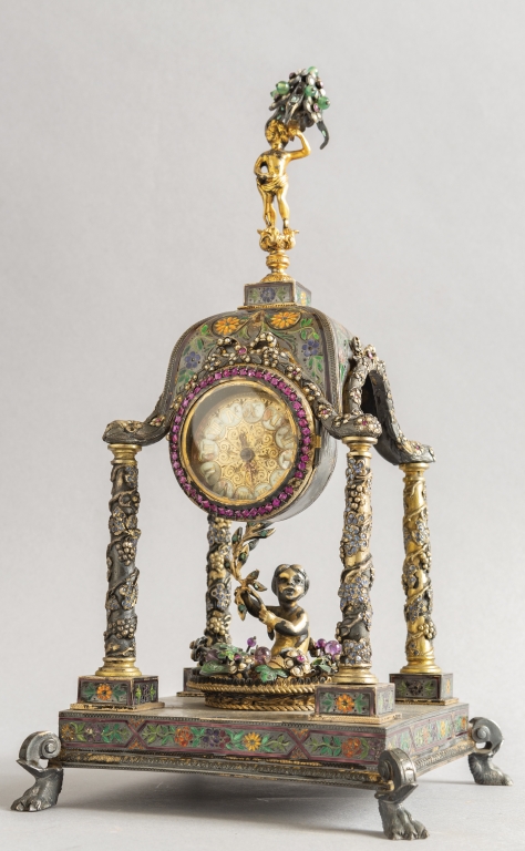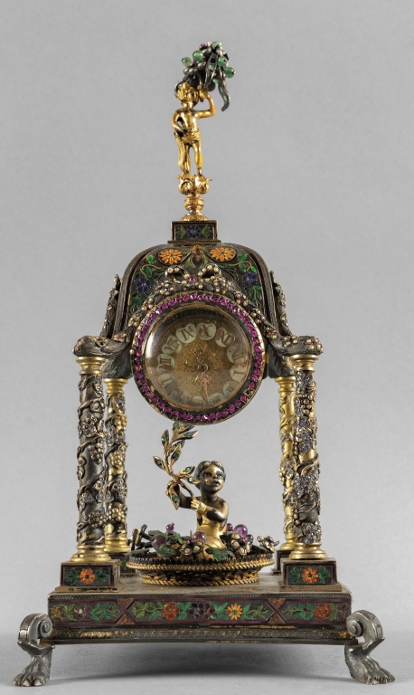 Orologio a portico a forma di tempio in argento argento dorato pietre dure perle e paste vitree su base quadrangolare con zampe feline Vienna sec.XIX