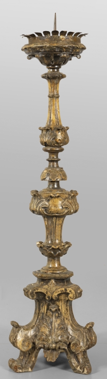 Grande candeliere Luigi XIV in legno intagliato e argentato a mecca inizi sec.XVIII
