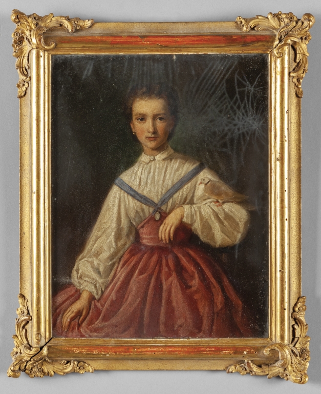 'Ragazza con tortora' olio sec.XIX cornice coeva in legno e gesso dorato