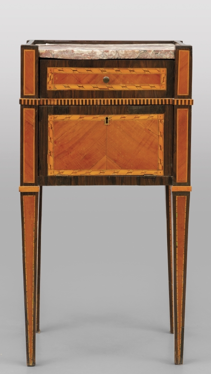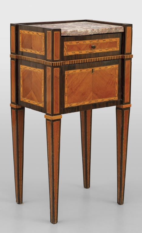 Comodino Luigi XVI lastronato in palissandro e finemente intagliato in bois de rose e legni vari un cassettino e uno sportello sul fronte gambe troncopiramidali Genova fine sec.XVIII
