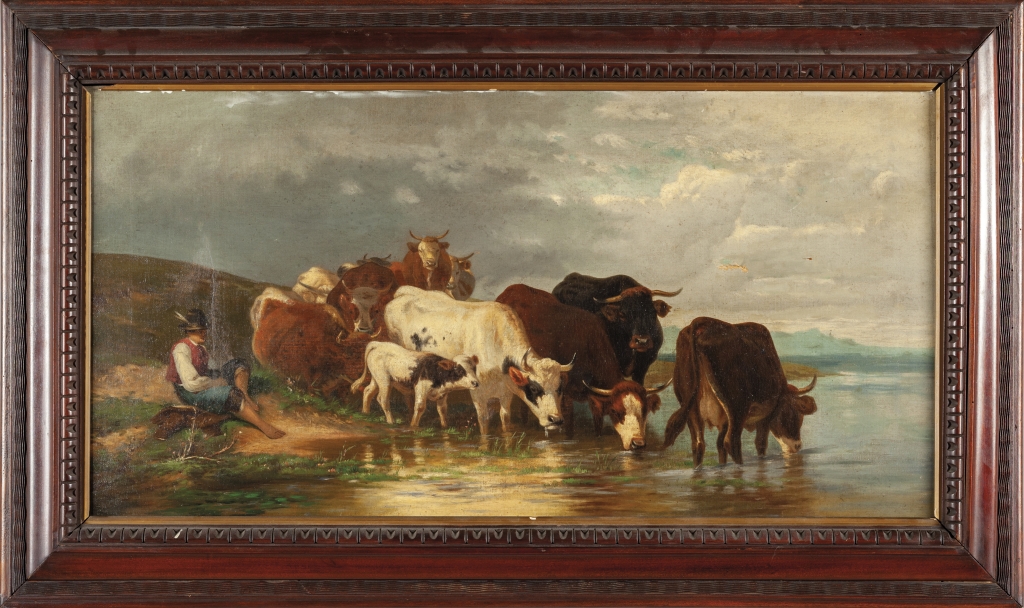 Scuola napoletana sec.XIX 'Sosta presso il fiume' olio