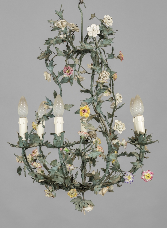 Lampadario in ferro battuto a sei luci ricca applicazione di fiori in porcellana Piemonte fine sec.XVIII
