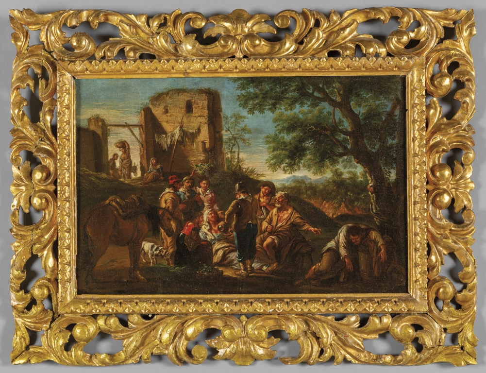 Scuola romana sec.XVIII 'La sosta' olio cornice in legno intagliato e dorato