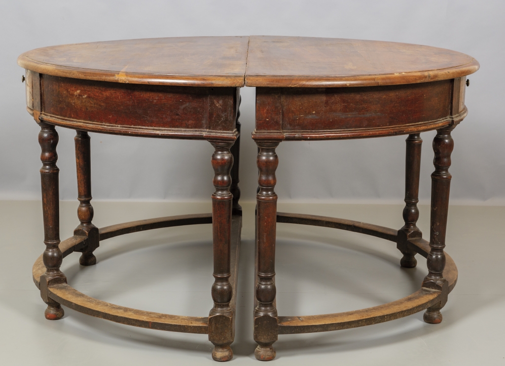 Coppia di mezzi tavoli a rocchetto in noce sec.XVIII