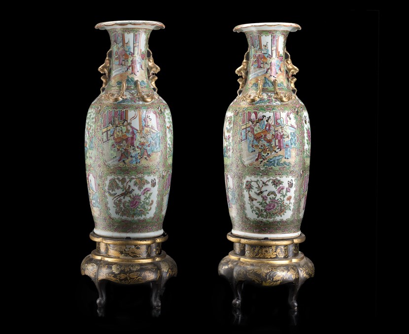 Coppia di vasi biansati in porcellana Famiglia Rosa cantonese, poggianti su basi in legno laccato (difetti e mancanze)