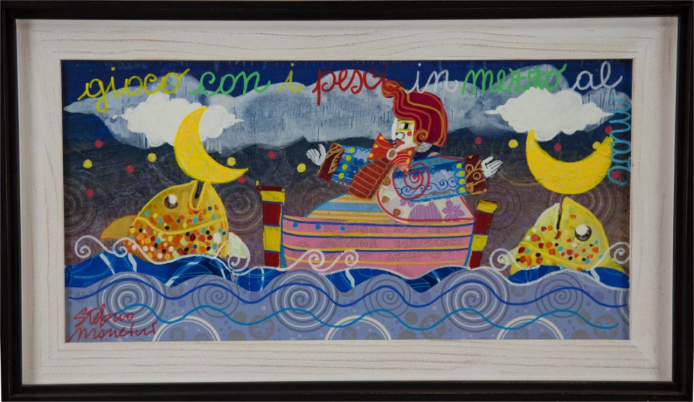 Stefano Mancini Gioco con i pesci in mezzo al mare, autentica dell'artista su foto Tecnica mista su tavola cm 25x50 anno 2013