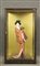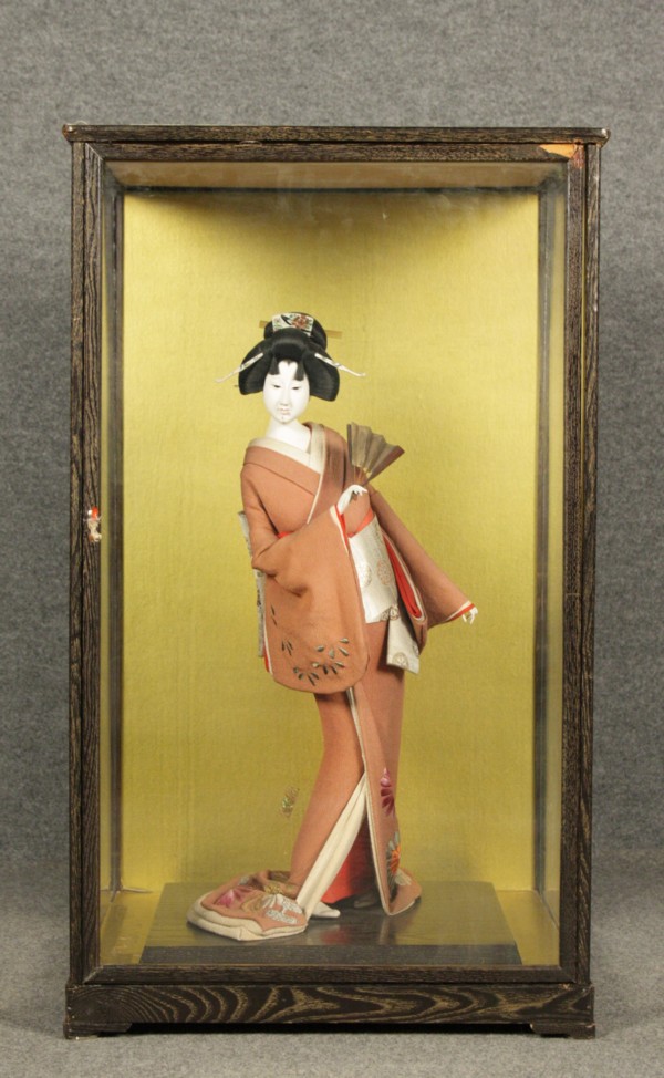 Firmato. Geisha con mani e piedi in bisquit e vestito in tessuto ricamato. Giappone. XX secolo. In teca. Mis. Alt. cm. 53 ca.