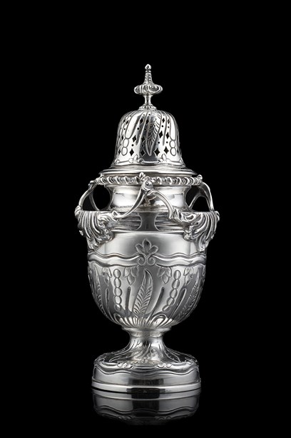 A pair of silver sugar casters. London, 1928. Silversmith Richard Comyns (h. cm 23) (g 459 ca.)