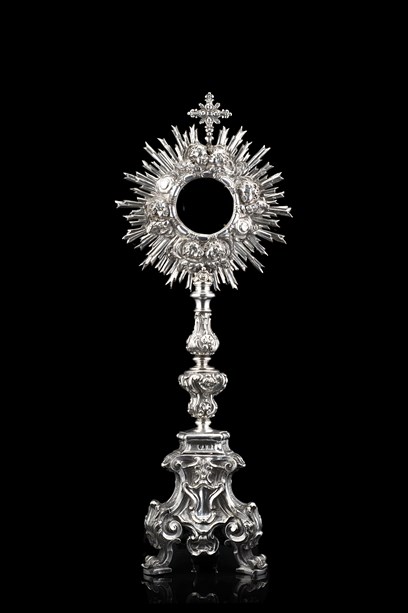 Ostensorio in argento con fusto a balaustro e base sagomata poggiante su tre piedi a volute fogliate. Raggiera ornata da cherubini tra nuvole sormontata da croce. Stato Pontificio, Roma, secolo XVIII (h. cm 60) (g lordi 1535 ca.) (difetti e restauri)