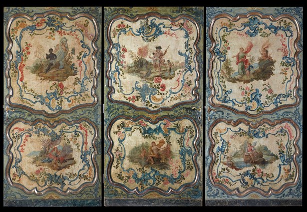 Gruppo di tre pannelli in legno laccato e dipinto su un lato a figure classiche entro cornici a fiori e volute con profili dorati. Secolo XVIII (cm 102x206) (difetti, montati su porte moderne)