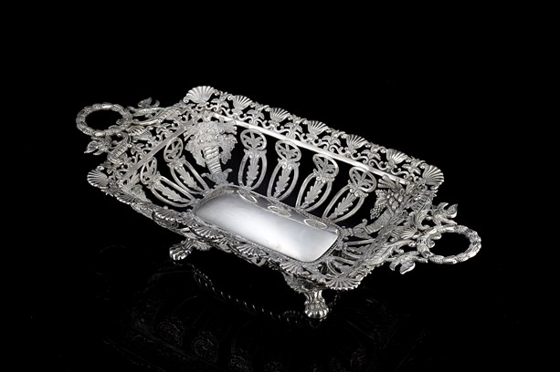 Centrotavola in argento con corpo sbalzato e traforato a cornucopie con frutti, spighe di grano e volute fogliate, anse ad anelli decorate a volatili. Impero Austro-Ungarico, metà secolo XIX (cm 40x8x18) (g 440 ca.) (lievi difetti)