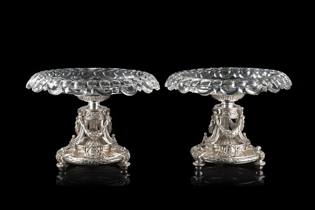 Coppia di alzate in argento con piatto in cristallo, fusto cesellato a foglie d'acanto, fiori e ghirlande sorrette da nastri. Base circolare decorata con stemmi entro cornici in foglie d'alloro. Piedi torniti. Parigi, secolo XIX. Argentiere Odiot, firmate e numerate 1754/818 (d. piatto cm 26; h. cm 16) (g 2140 ca.) (lievi difetti)