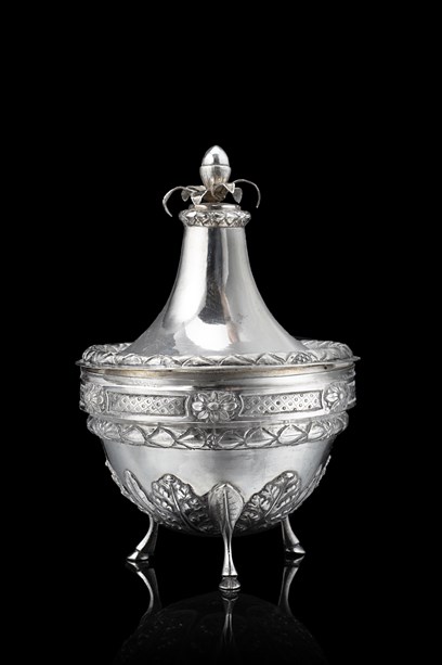 Zuccheriera tripode con coperchio in argento sbalzato a motivi vegetali e stilizzati. Coperchio cimato da ghianda poggiante su foglie, piedini terminanti a zoccolo. Genova, 1794 (h. cm 19 ca.) (g 330 ca) (difetti)
