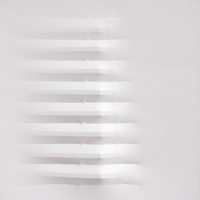 BONALUMI Agostino Vimercate (MI) 1935 Bianco, anni 70 tempera vinilica su tela estroflessa, cm. 70 x 70 Firma 'Bonalumi' (al retro) Autentica dell'artista su fotografia, in data '91