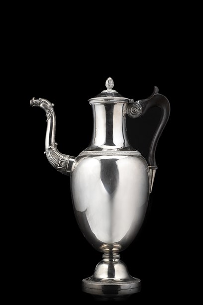 Caffettiera in argento a corpo ovoidale liscio con beccuccio zoomorfo. Ansa a voluta in legno ebanizzato e presa a guisa di pigna a tutto tondo. Parigi, prima metà secolo XIX (h. cm 36) (g lordi 1220 ca.)