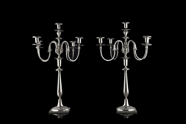 A pair of silver five-light candelabras. Tuscany, first half of the 19th Century (h. cm 64) (g gross 5600 ca.) (minor defects)