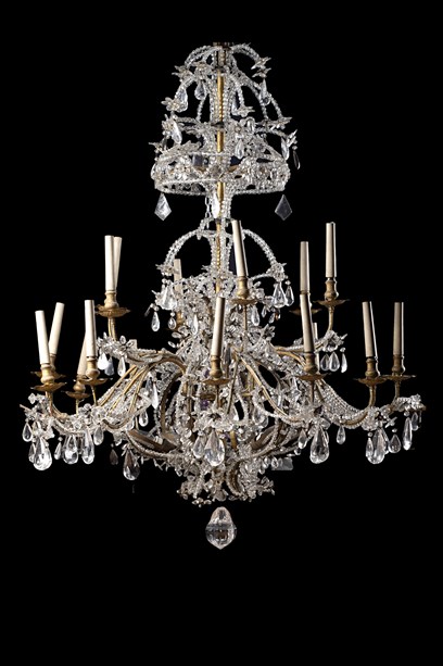 A 18th-light gilt-metal chandelier with Rocca crystal pendant drops. Genoa, 18th century (h. cm 140) (defects)