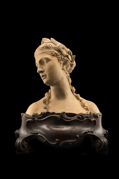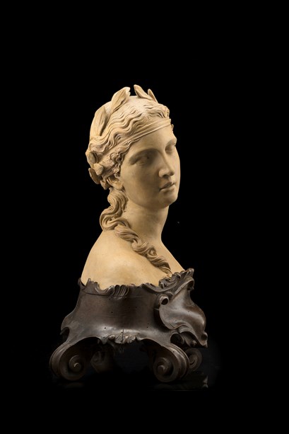 "Female head" terracotta half bust on its original carved wooden base (h. tot cm 53) (defects and restorations)