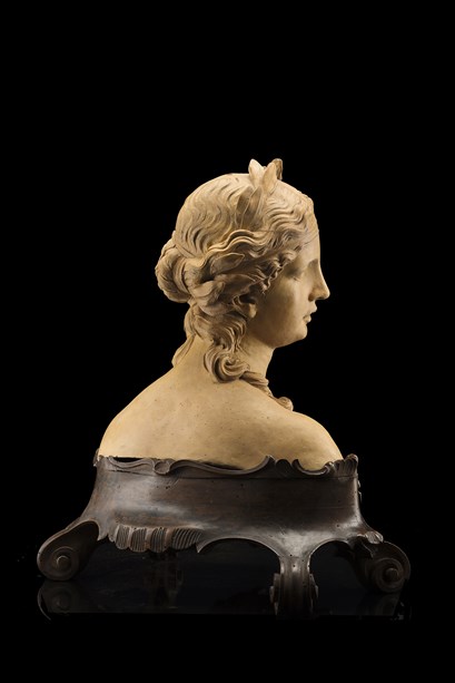 "Testa femminile" mezzobusto in terracotta, base dell'epoca in legno intagliato a volute con piedi terminanti a ricciolo (h. tot cm 53) (difetti e restauri)