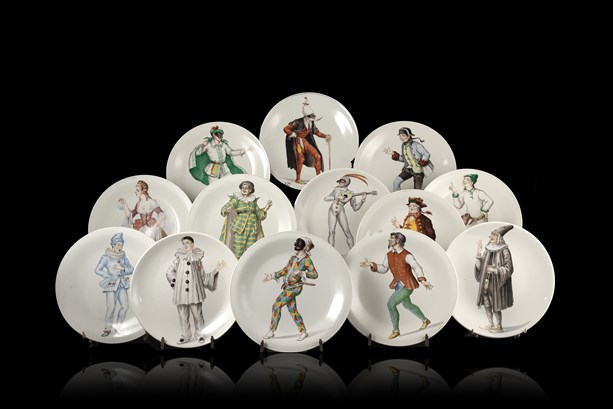 Manifattura inizio secolo XX. Gruppo di tredici piatti in ceramica dipinti in policromia a maschere della Commedia dell'Arte (d. cm 23) (difetti)