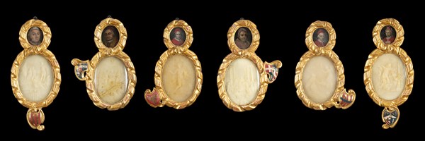 A group of six 18th-century wax medallions representing religious scenes, in giltwood frames, decorated with polychrome coat of arms (cad cm 25x28) (defects)