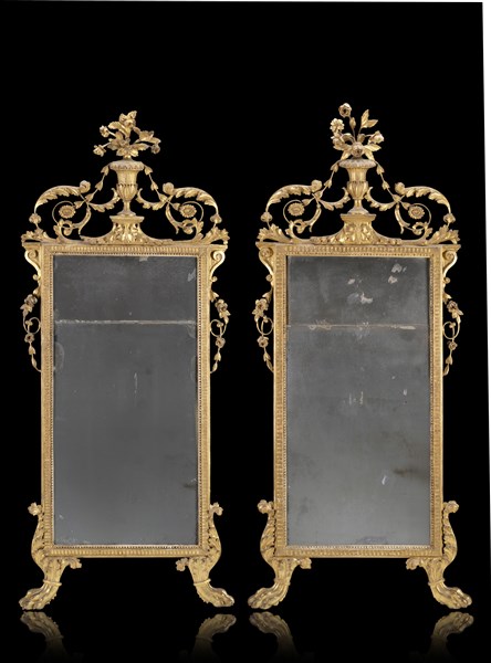 Coppia di specchiere in legno intagliato e dorato, cimasa scolpita e traforata, centrata da vaso e rami fioriti. Piedi ferini. Toscana, secolo XVIII (cm 170x72) (difetti)