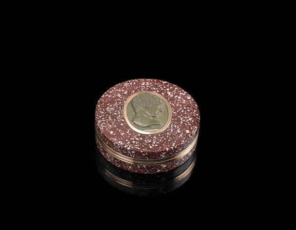 A phorphyry snuff-box with low karat gold mount, the cover decorated with a cameo with a classical profile. Rome, early 19th century (d. cm 7x2) (minor defects)