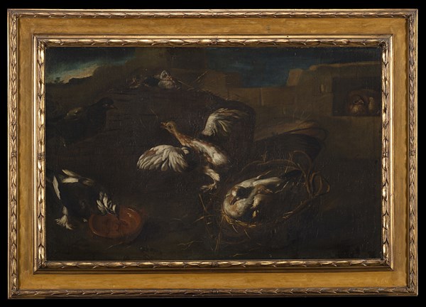 Scuola emiliana del secolo XVIII Volatili in un paesaggio Olio su tela cm 67x1