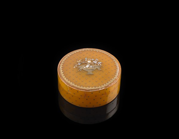 A 19th-century piqué blonde tortoiseshell and gold, silver, mother-of-pearl and metal inlaid snuff-box (d. cm 6) (restorations)