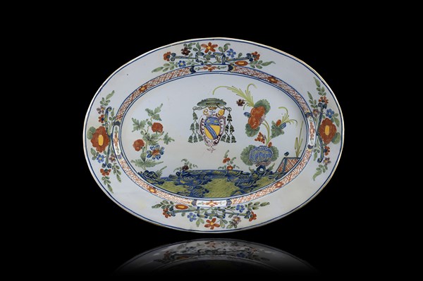 Manifattura di Faenza, Ferniani, fine secolo XVIII. Grande vassoio ovale in maiolica con decoro policromo a fiori centrato da stemma vescovile (cm 41x31) (restauri)