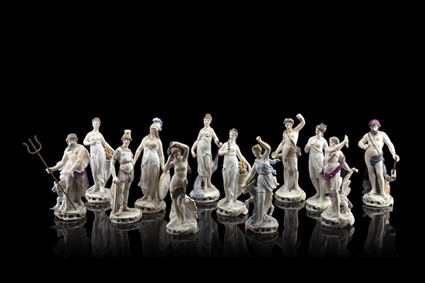 Manifattura di Meissen e manifattura tedesca, secolo XIX. Gruppo di dodici figure in porcellana policroma raffiguranti divinità ed allegorie (h. max cm 15 ca.) (difetti e restauri)