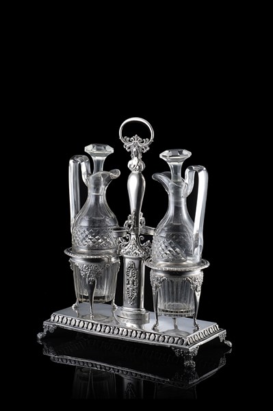 Cruet in argento con presa ad anello decorata a mezzo busto femminile su colonna con fregi a volute fogliate. Portabottiglie sbalzato a motivi vegetali e terminante in piedi caprini. Base rettangolare con fascia traforata e ornamenti stilizzati poggiante su piedi ferini. Milano, secolo XIX. Bottiglie non coeve (cm 26x33) (g 592 ca.) (difetti)