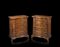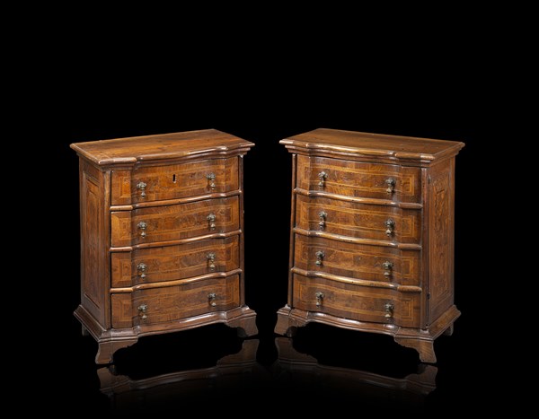 Coppia di comodini di forma mossa lastronati in noce e filettati, uno a quattro cassetti, l'altro ad un'anta a finti cassetti. Lombardia, secolo XVIII (cm 66x81x39) (difetti)