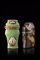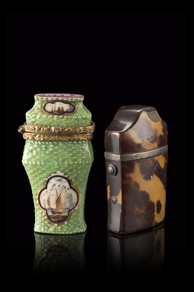 Manifattura dell'inizio del secolo XIX. Porta pillole in porcellana a fondo verde decorato a paesaggi marini con figure entro riserve polilobate e dorate, coperchio e base decorati a paesaggi nei toni del prugna (h. cm 6,5) Unito ad uno lastronato in tartaruga (difetti e mancanze)