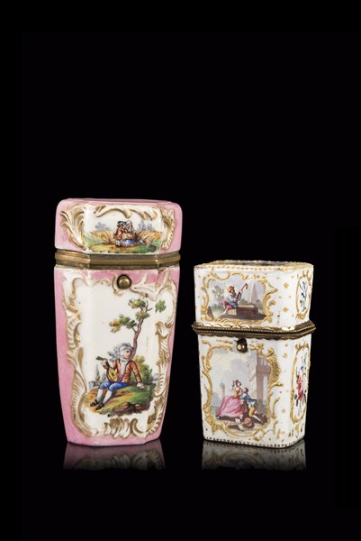 Manifatture diverse, secolo XVIII/XIX. Due porta nécessaire in porcellana decorati in policromia entro riserve a paesaggi con figure entro cornici a volute in rilievo. Misure diverse (lievi difetti e mancanze)