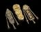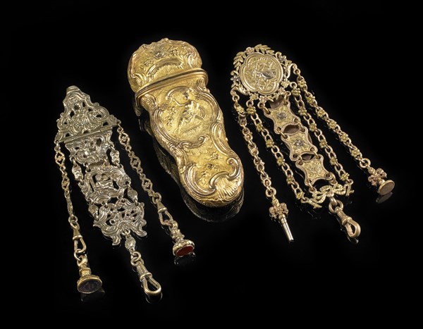 Lotto composto da un porta nécessaire in metallo dorato di forma sagomata sbalzato a figure e volute, unito a due chatelaine porta orologi di epoca e decoro diverso in argento dorato, di cui una di Edwin Thomson Bryant, Londra, 1891