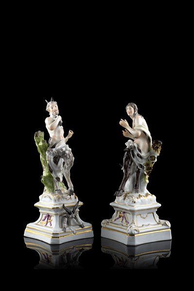 Manifattura di Vienna, secolo XIX "Satiro e satiressa" due gruppi in porcellana policroma su basi a rocailles profilate in oro. Marca di fabbrica alla base (h. max cm 21,5) (difetti)
