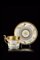 Manifattura di Vienna, secolo XIX. Tazza con piattino in porcellana profilata in oro e decorata con animali fantastici, ansa zoomorfa, marca di fabbrica alla base (difetti)