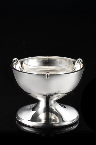 Porta caviale in argento con vaschetta in vetro, contenuto in scatola originale. Argentiere Bulgari, titolo 925 (g 270 ca.) (lievi difetti)