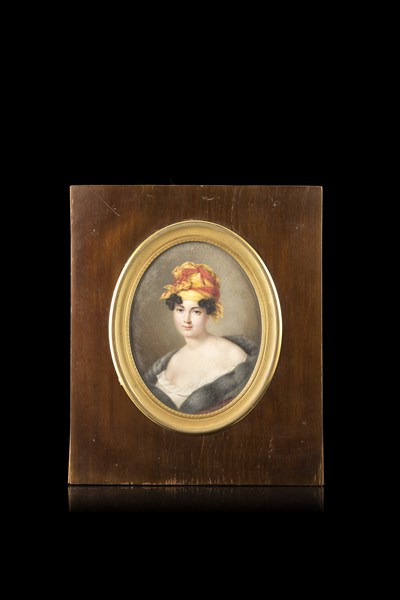 Maestro del secolo XIX "Ritratto di donna con cuffia gialla" miniatura ovale su