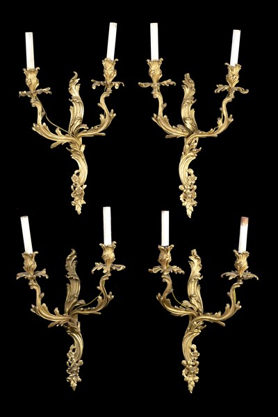 Gruppo di quattro appliques in bronzo dorato a due luci decorate a ramage e fio