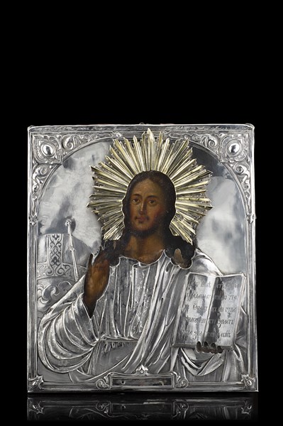 Arte russa del secolo XIX. Icona ad olio su tavola raffigurante Cristo Pantocratore. Riza in argento inciso e sbalzato con aureola dorata. Marchi di Mosca non coevi del 1852 (cm 37x32) (difetti)